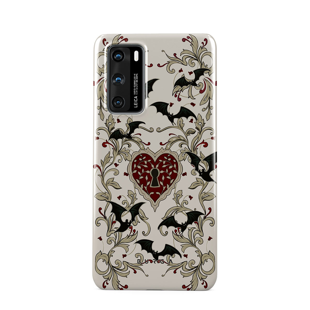 このデザインの特徴:ハート、鍵、コウモリ、ゴシック模様