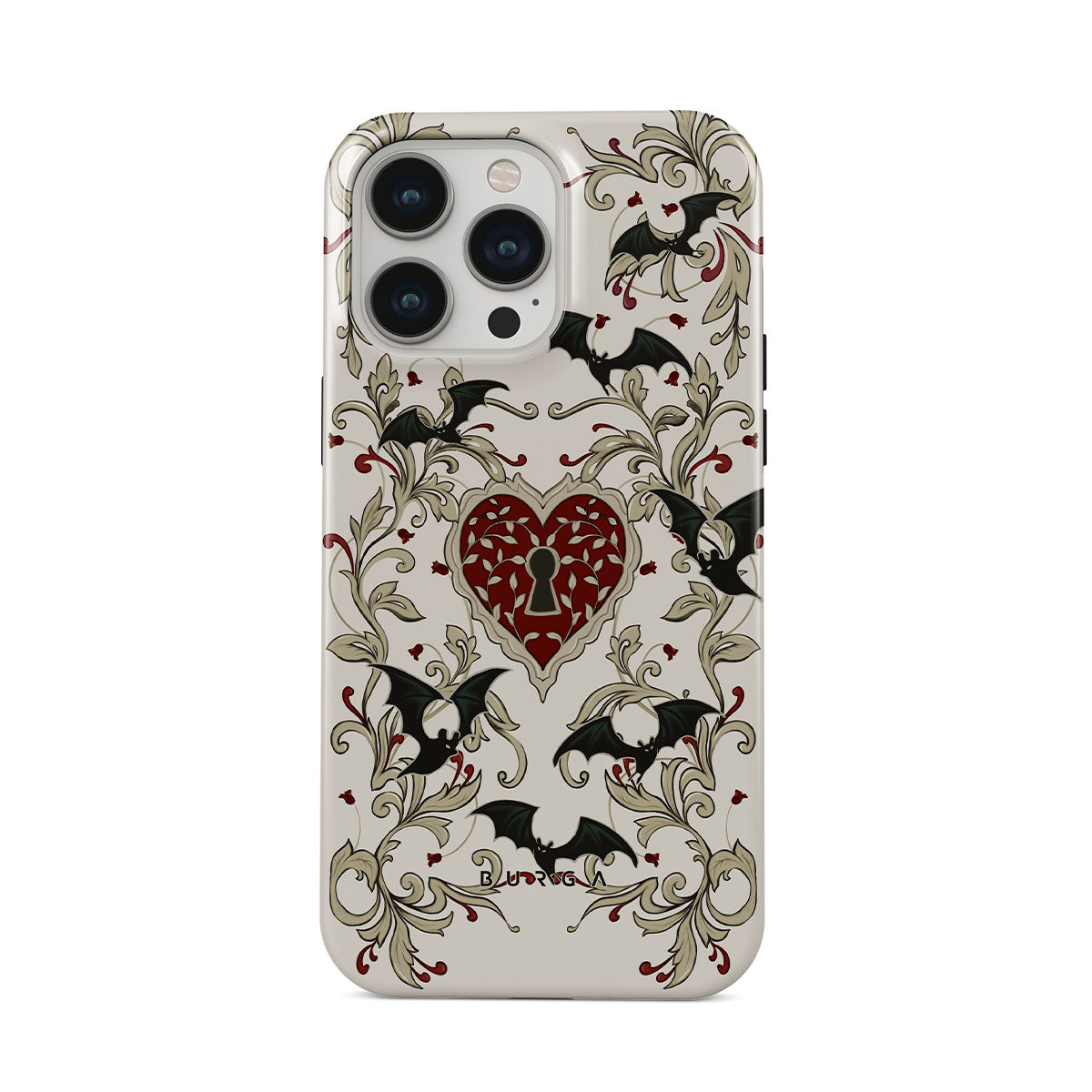 このデザインの特徴:ハート、鍵、コウモリ、ゴシック模様