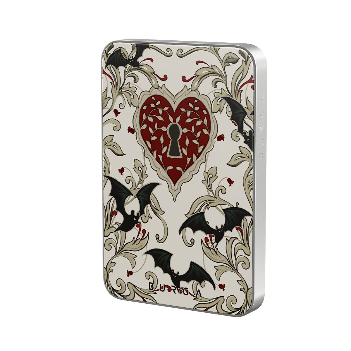このデザインの特徴:ハート、鍵、コウモリ、ゴシック模様