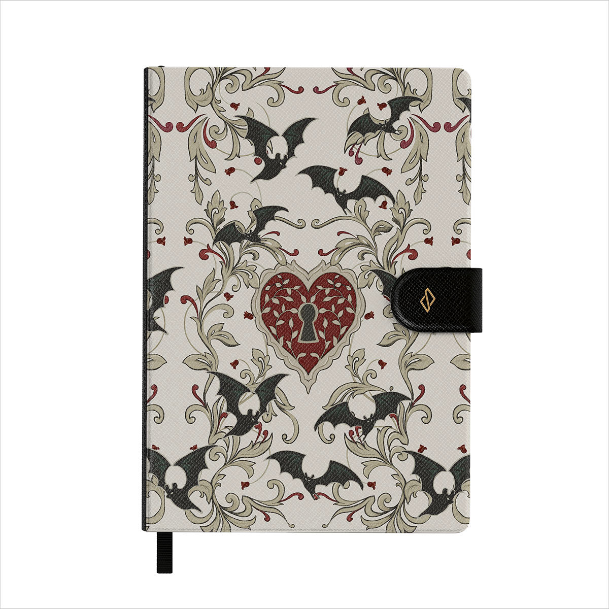 このデザインの特徴:ハート、鍵、コウモリ、ゴシック模様