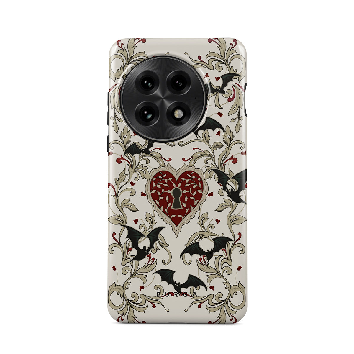 このデザインの特徴:ハート、鍵、コウモリ、ゴシック模様