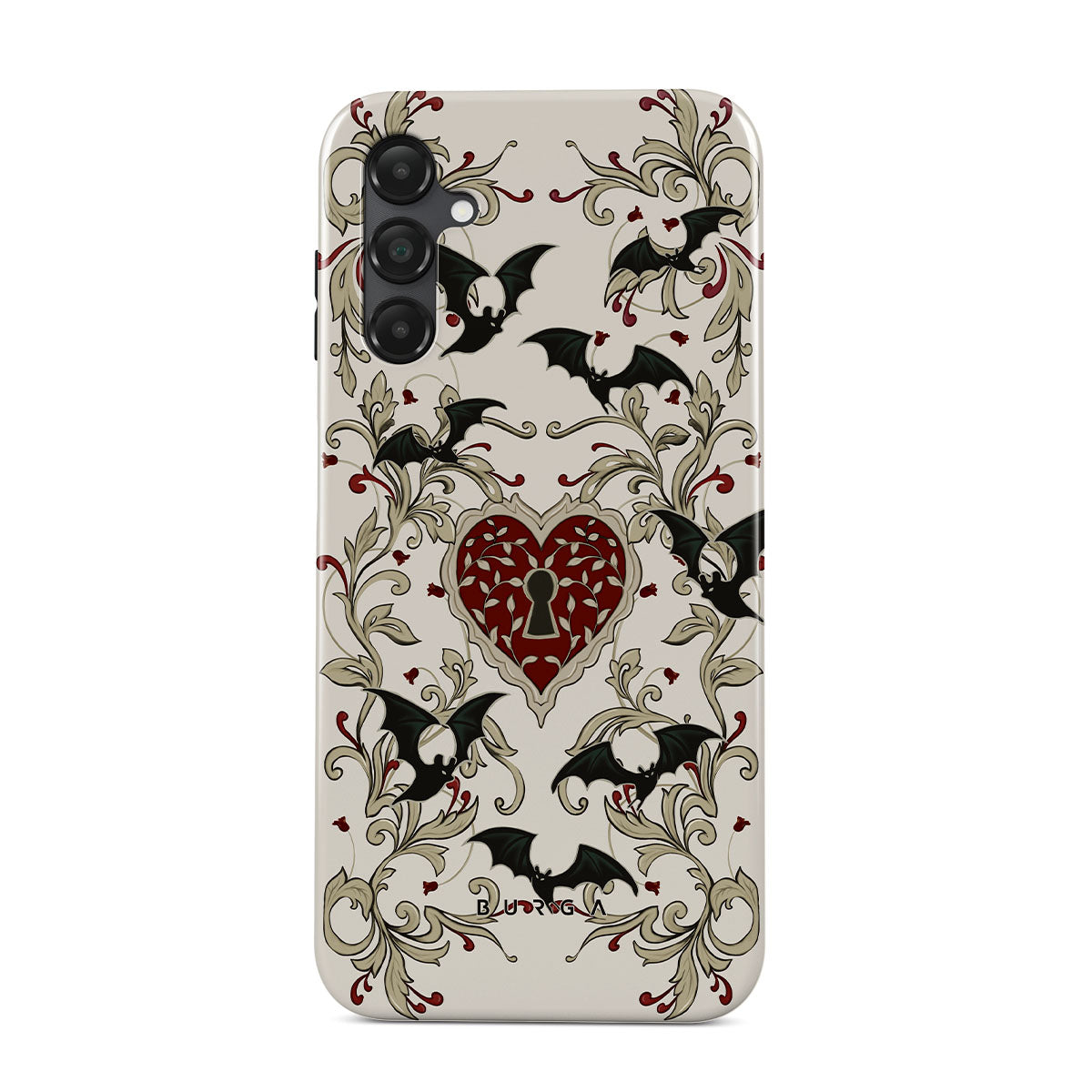 このデザインの特徴:ハート、鍵、コウモリ、ゴシック模様