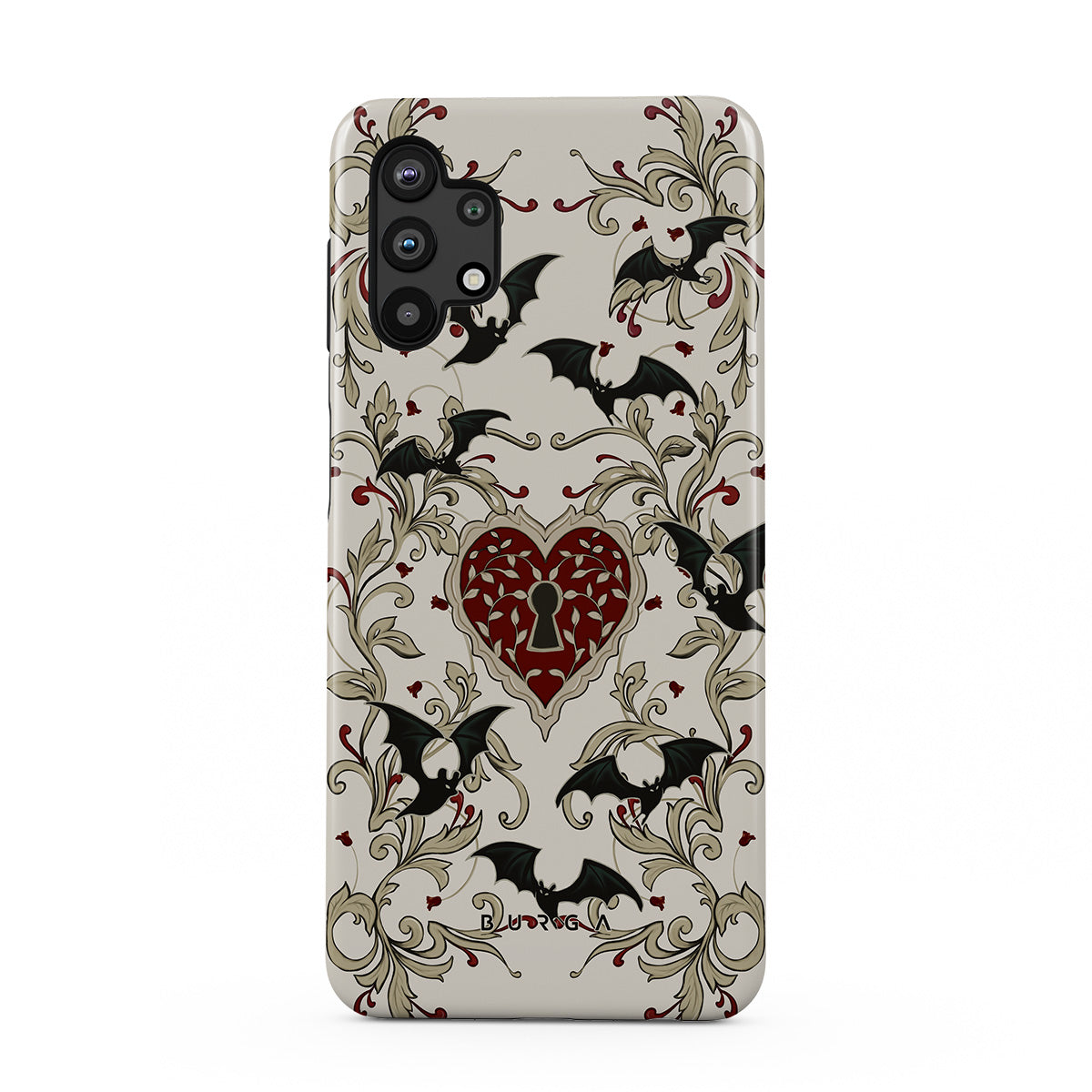 このデザインの特徴:ハート、鍵、コウモリ、ゴシック模様