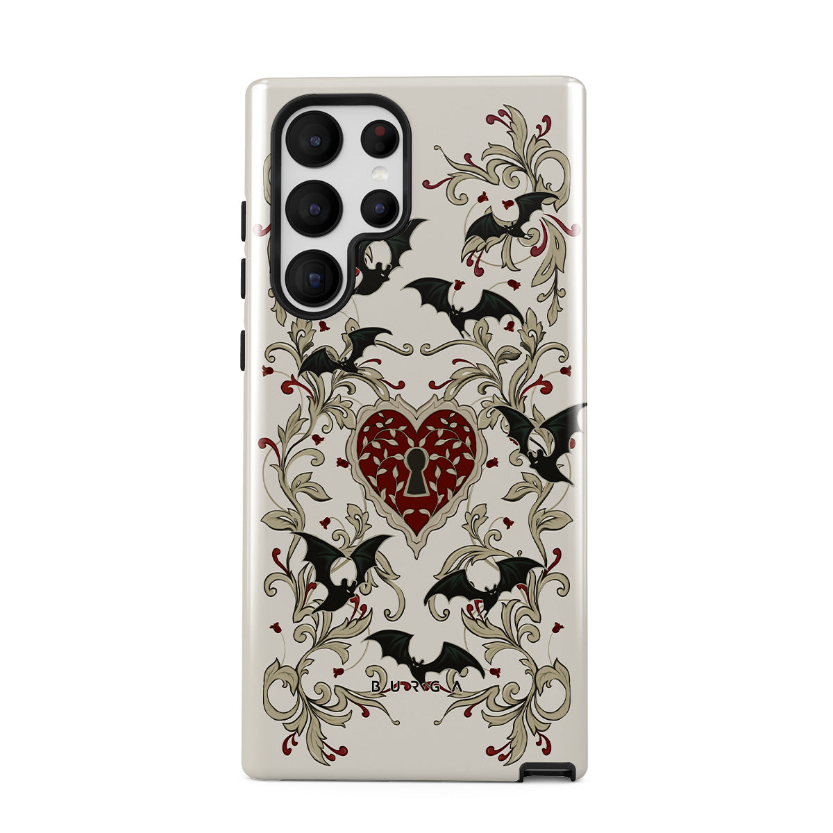 このデザインの特徴:ハート、鍵、コウモリ、ゴシック模様