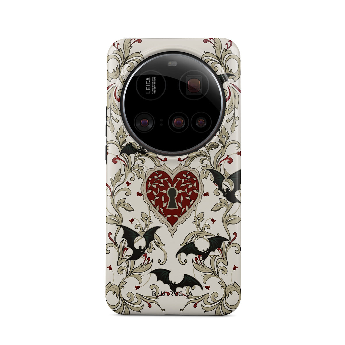 このデザインの特徴:ハート、鍵、コウモリ、ゴシック模様