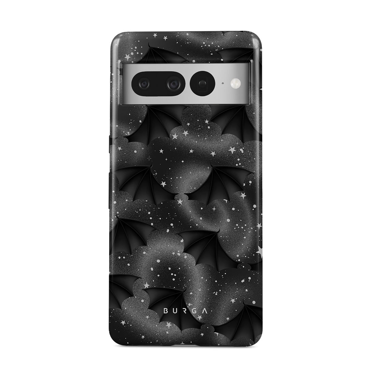 このデザインの特徴:コウモリの翼、星、神秘的な渦、黒い空