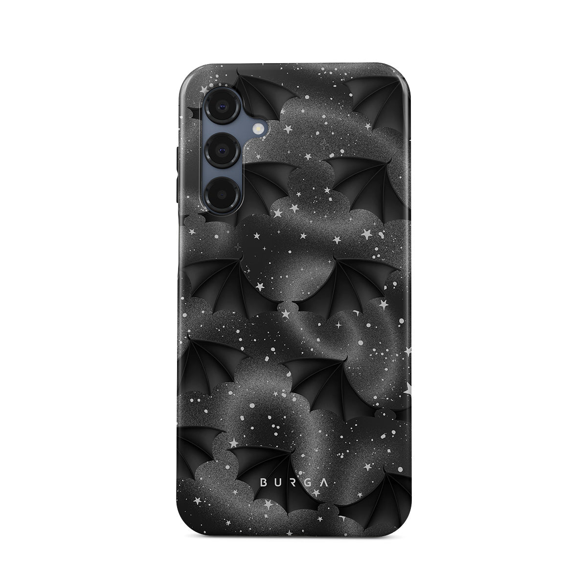 このデザインの特徴:コウモリの翼、星、神秘的な渦、黒い空