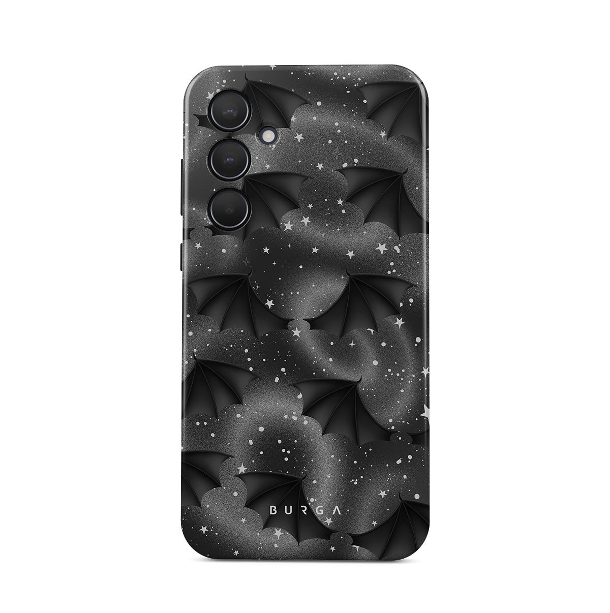 このデザインの特徴:コウモリの翼、星、神秘的な渦、黒い空