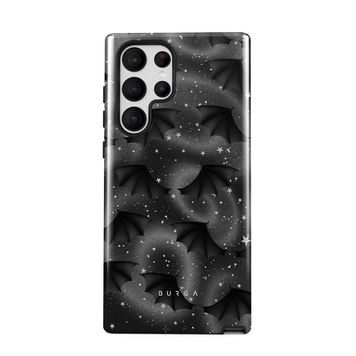 このデザインの特徴:コウモリの翼、星、神秘的な渦、黒い空