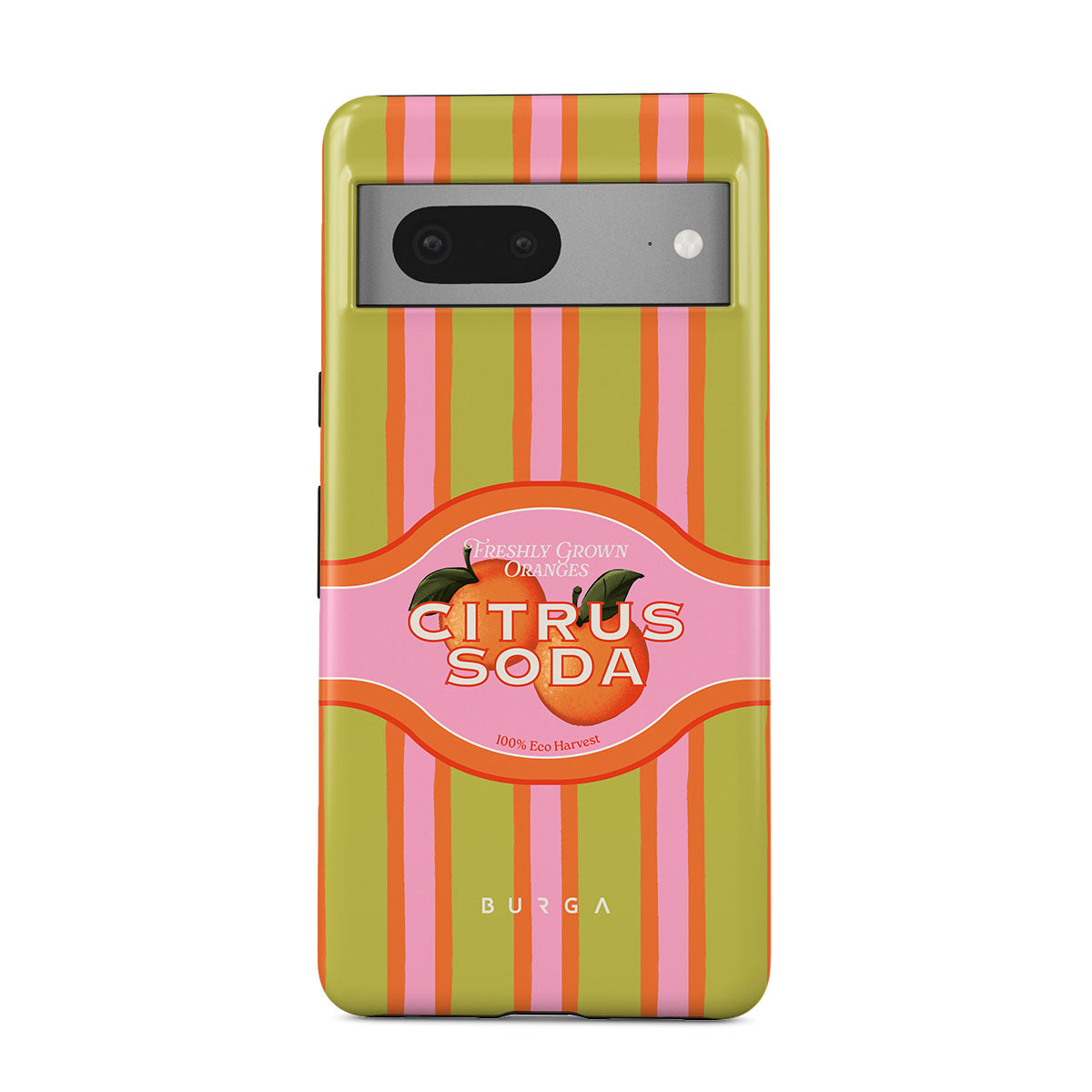 このデザインの特徴:ビビッドなシトラスストライプ、テキスト、シトラス植物、マンダリンオレンジ、グレープフルーツ