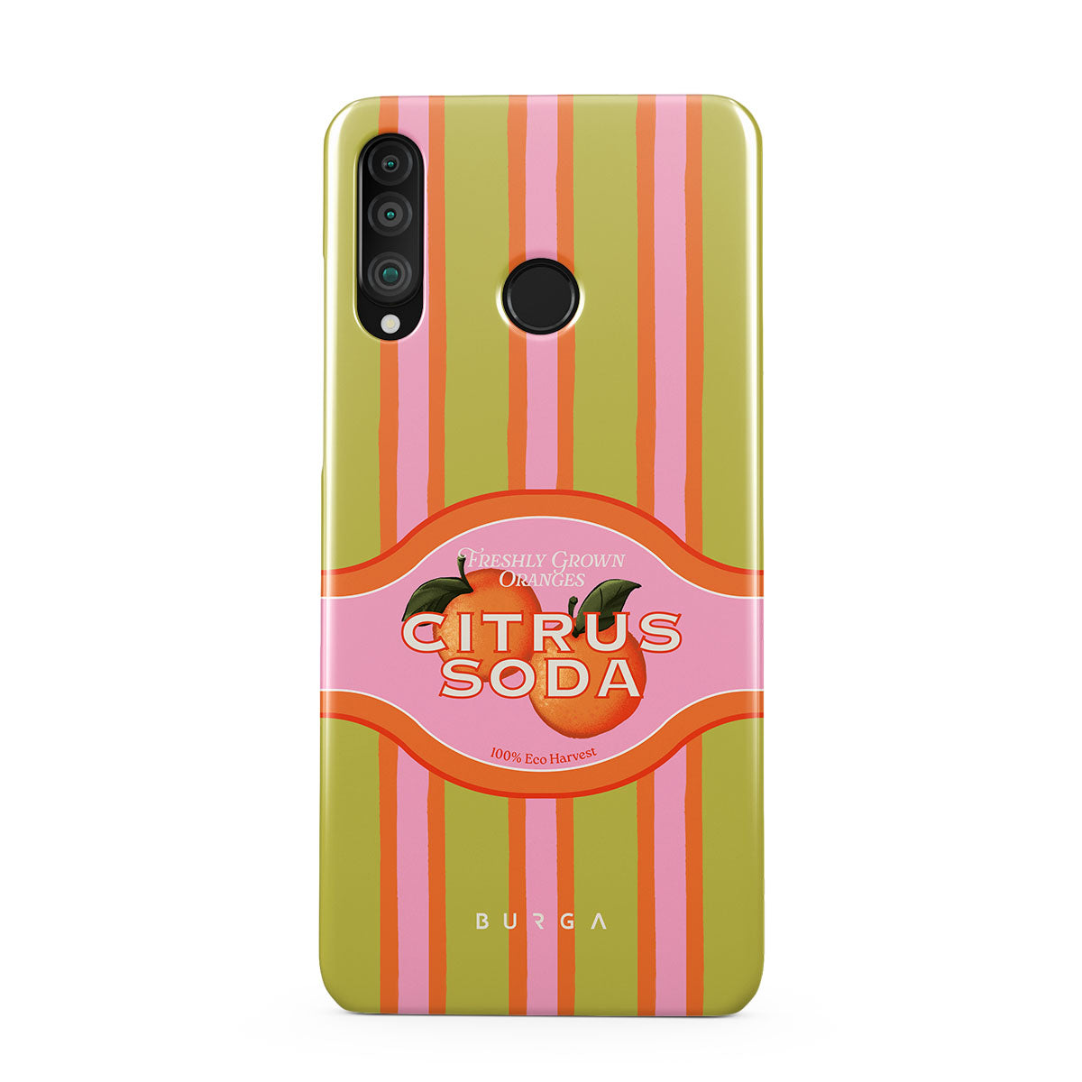 このデザインの特徴:ビビッドなシトラスストライプ、テキスト、シトラス植物、マンダリンオレンジ、グレープフルーツ
