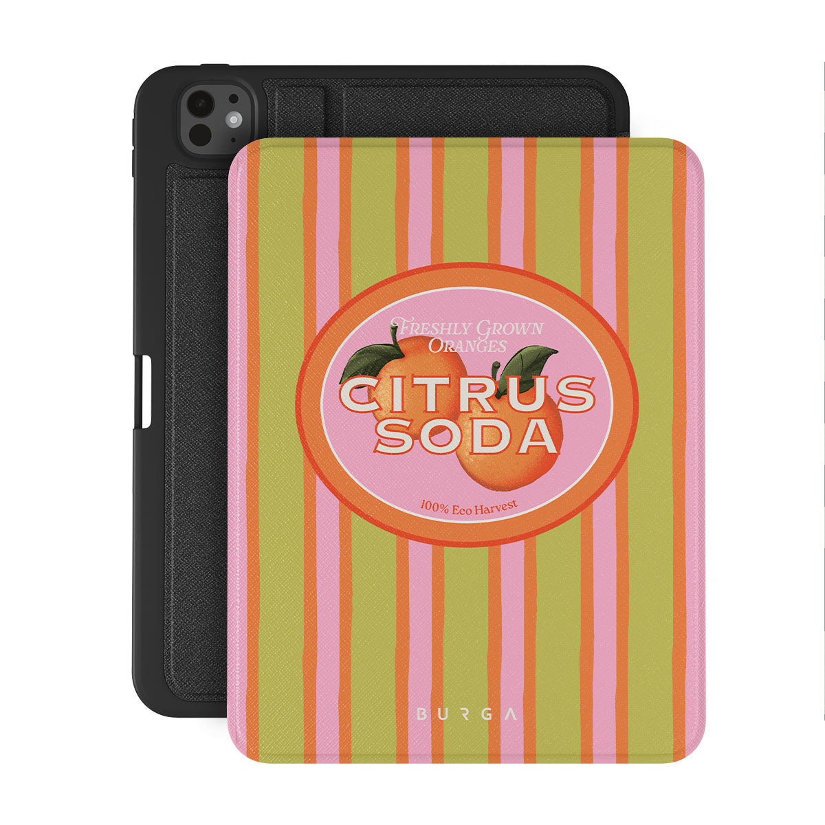 このデザインの特徴:ビビッドなシトラスストライプ、テキスト、シトラス植物、マンダリンオレンジ、グレープフルーツ