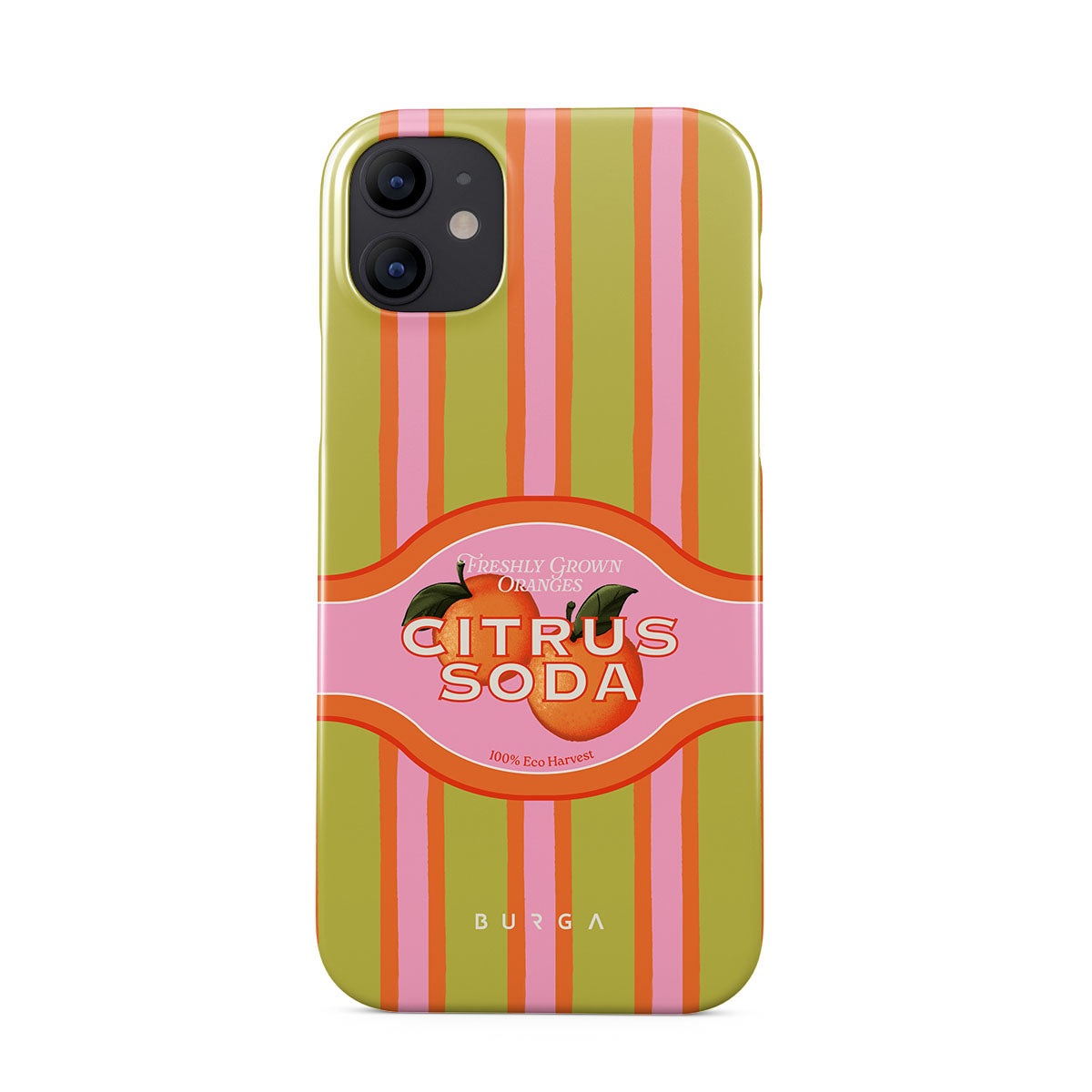 このデザインの特徴:ビビッドなシトラスストライプ、テキスト、シトラス植物、マンダリンオレンジ、グレープフルーツ