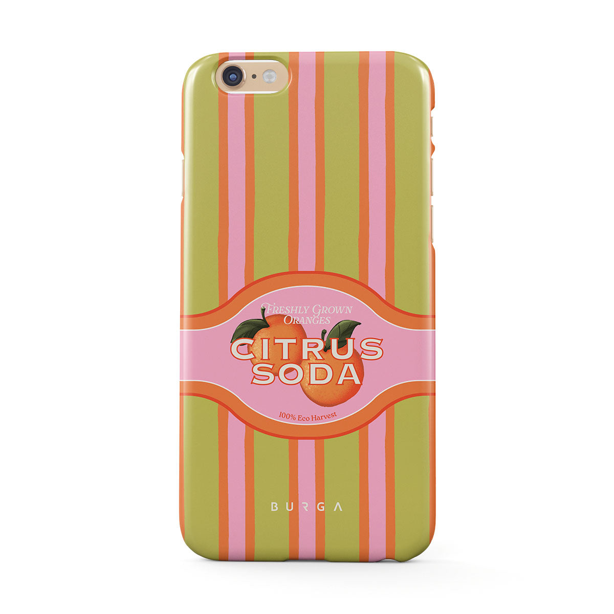 このデザインの特徴:ビビッドなシトラスストライプ、テキスト、シトラス植物、マンダリンオレンジ、グレープフルーツ