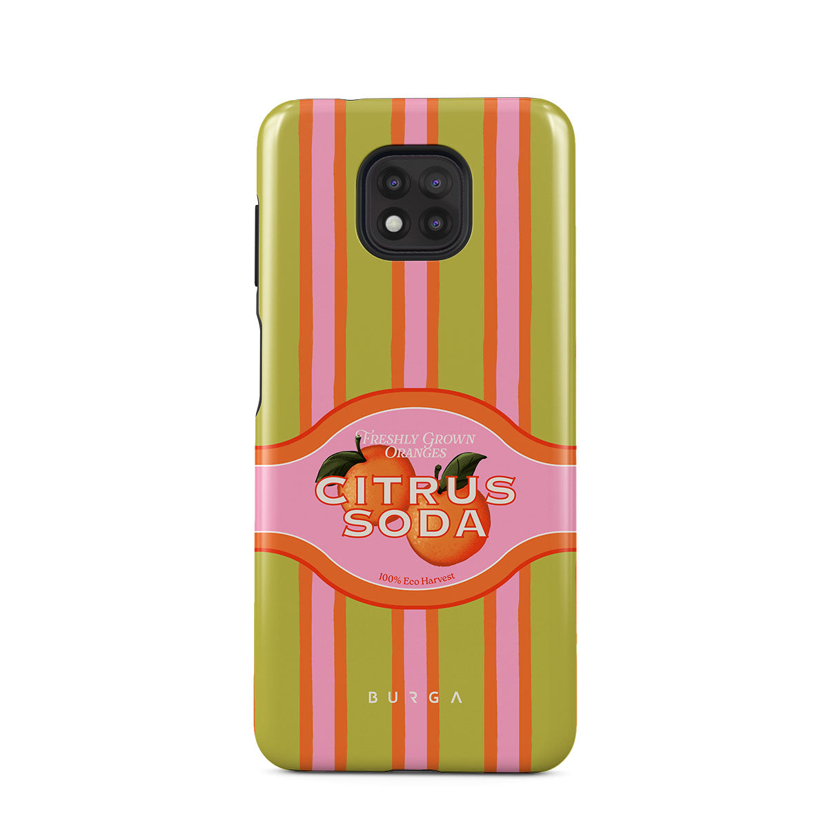 このデザインの特徴:ビビッドなシトラスストライプ、テキスト、シトラス植物、マンダリンオレンジ、グレープフルーツ