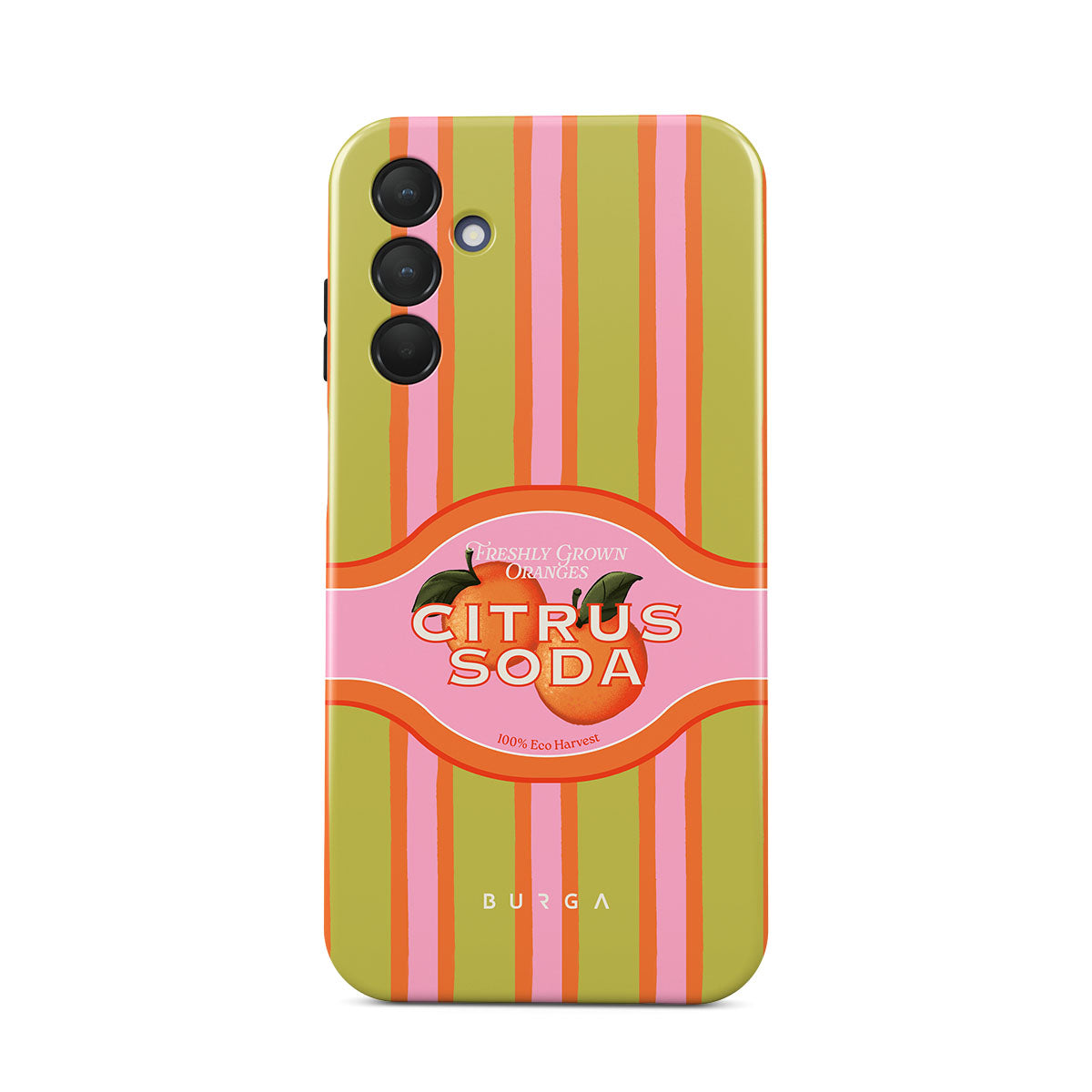 このデザインの特徴:ビビッドなシトラスストライプ、テキスト、シトラス植物、マンダリンオレンジ、グレープフルーツ