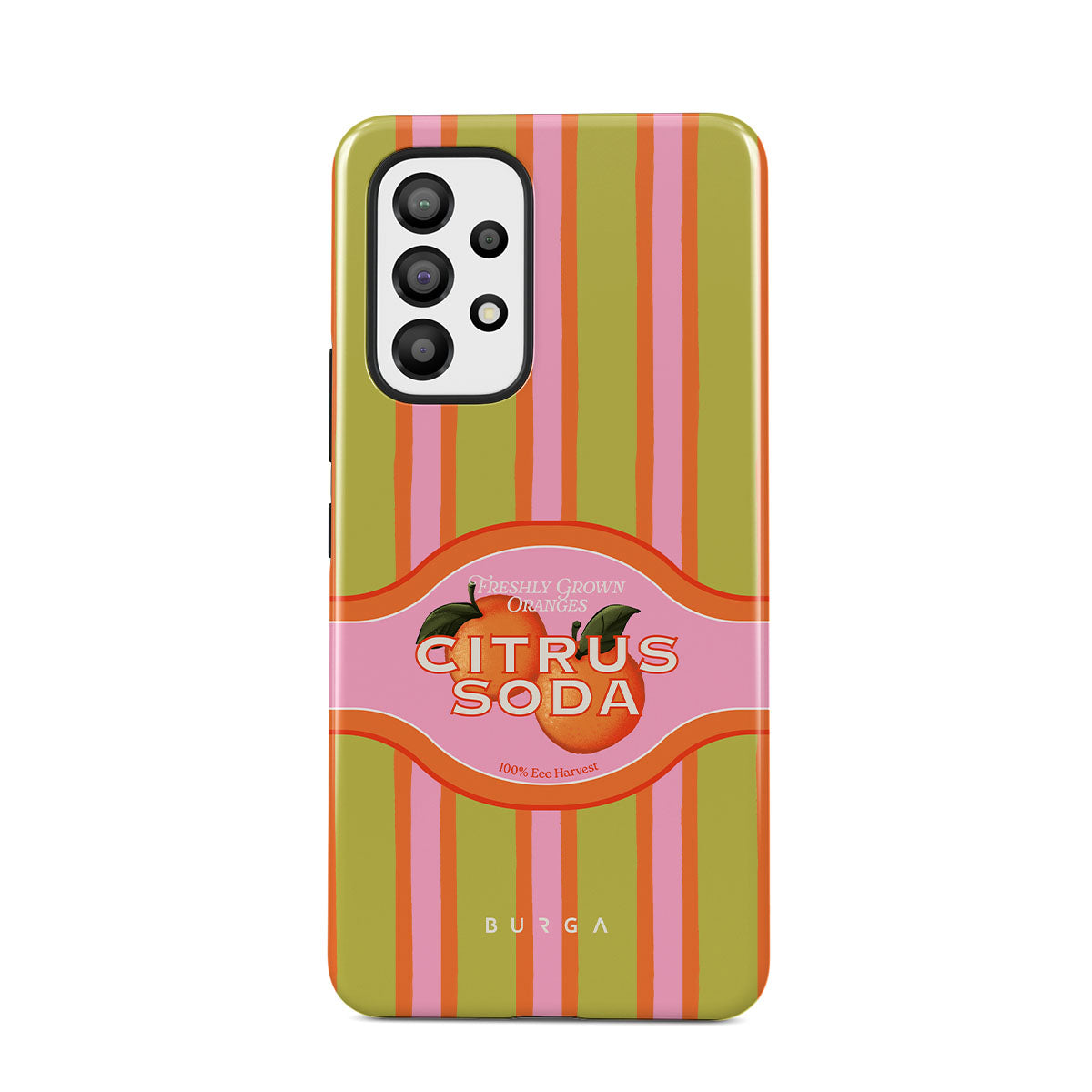 このデザインの特徴:ビビッドなシトラスストライプ、テキスト、シトラス植物、マンダリンオレンジ、グレープフルーツ