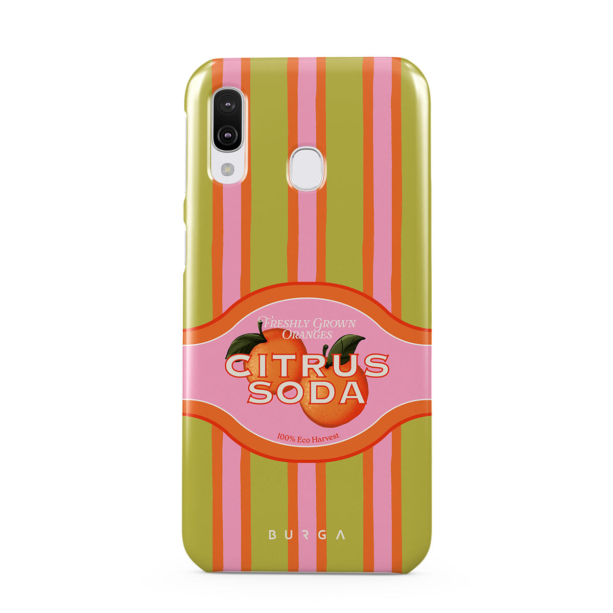 このデザインの特徴:ビビッドなシトラスストライプ、テキスト、シトラス植物、マンダリンオレンジ、グレープフルーツ
