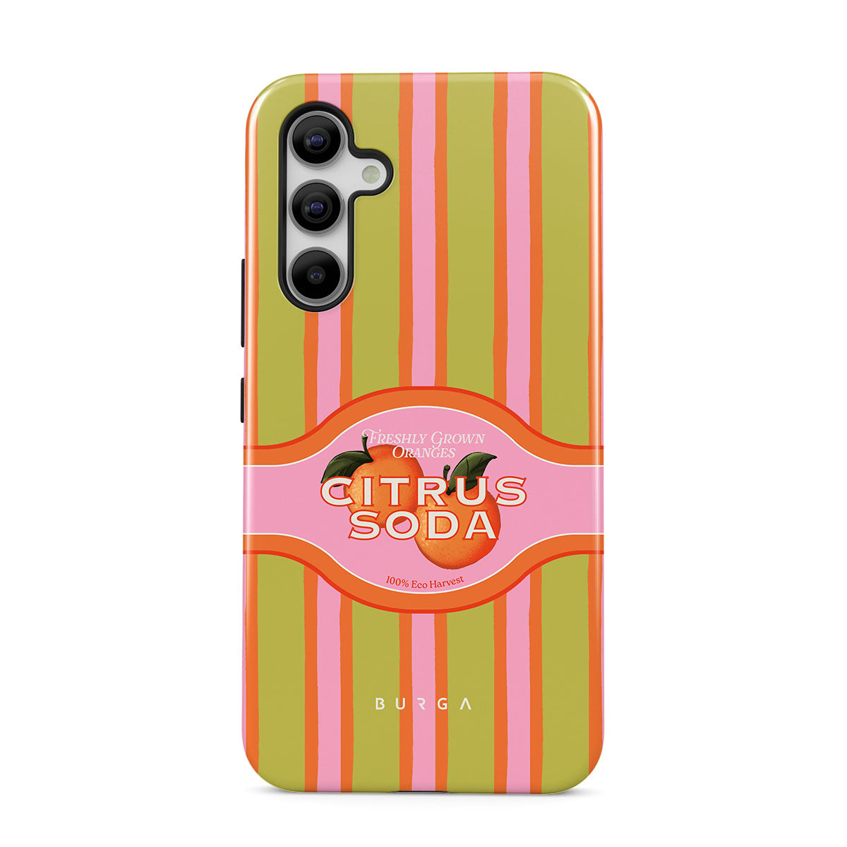 このデザインの特徴:ビビッドなシトラスストライプ、テキスト、シトラス植物、マンダリンオレンジ、グレープフルーツ