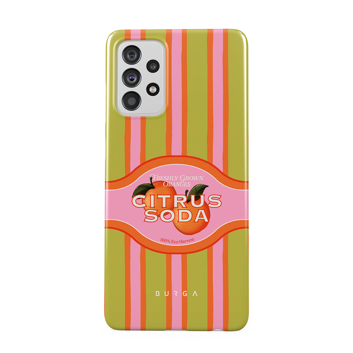 このデザインの特徴:ビビッドなシトラスストライプ、テキスト、シトラス植物、マンダリンオレンジ、グレープフルーツ