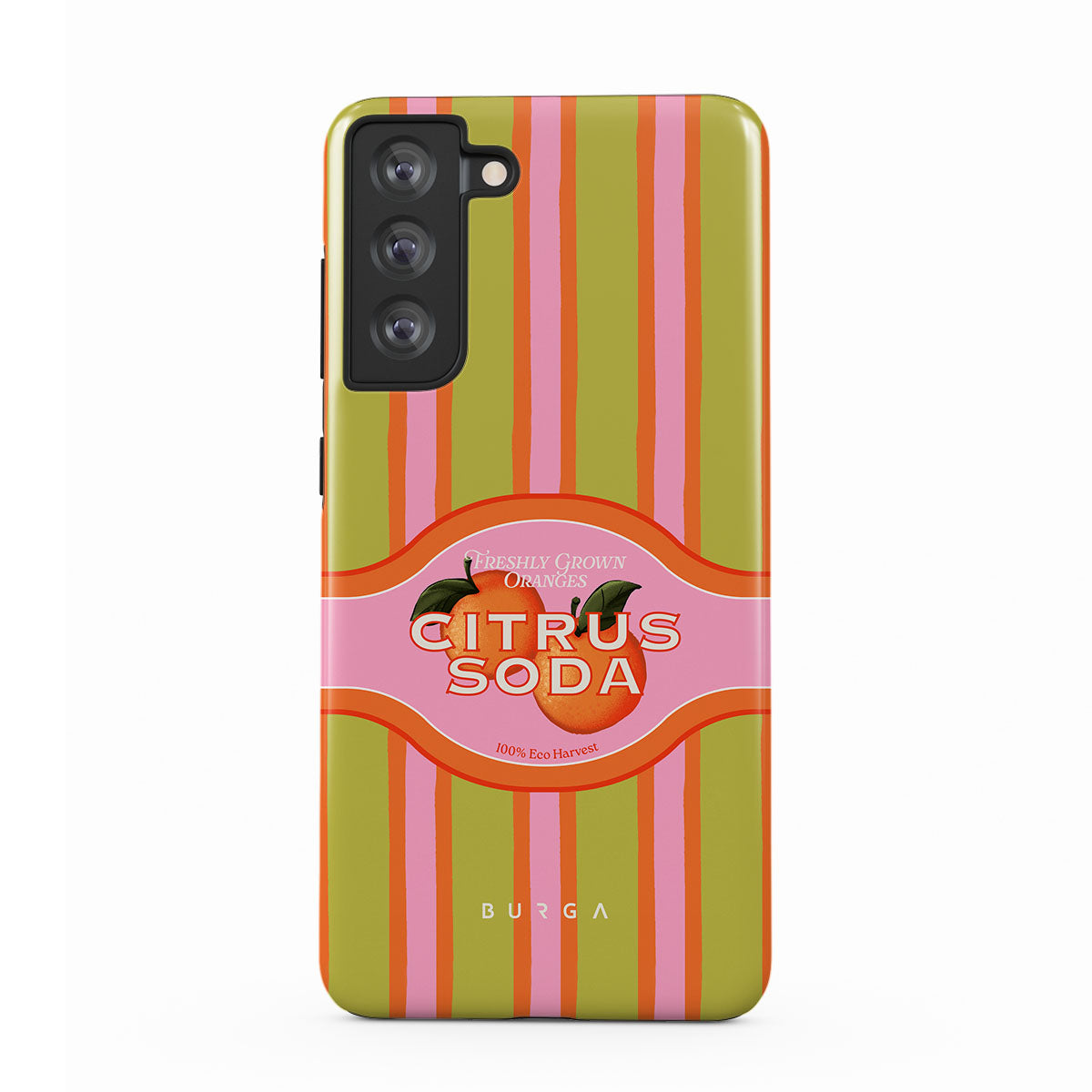 このデザインの特徴:ビビッドなシトラスストライプ、テキスト、シトラス植物、マンダリンオレンジ、グレープフルーツ