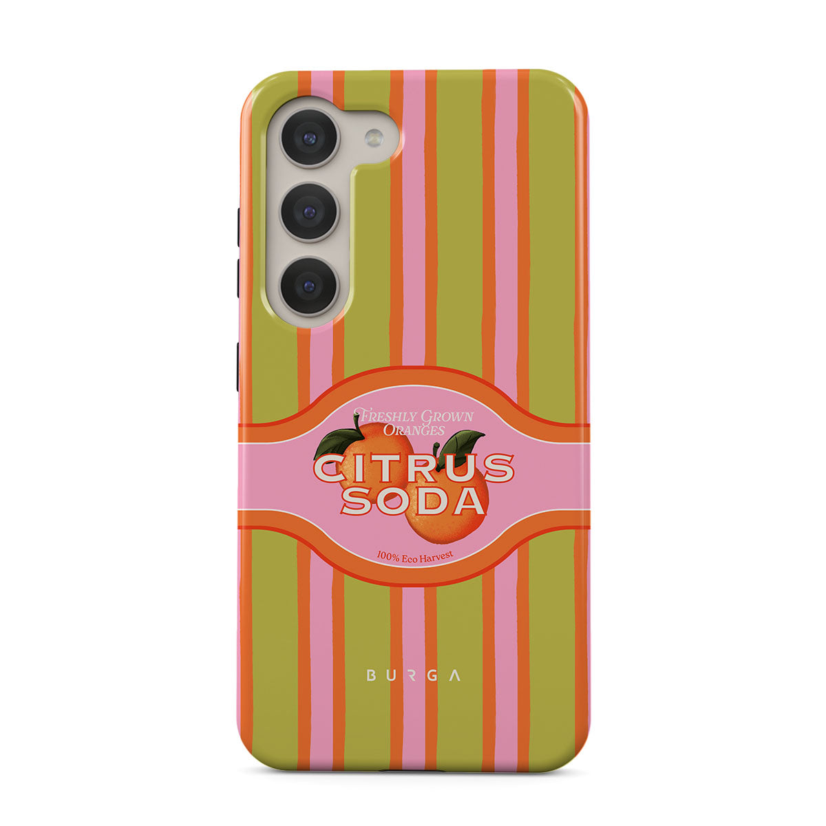 このデザインの特徴:ビビッドなシトラスストライプ、テキスト、シトラス植物、マンダリンオレンジ、グレープフルーツ