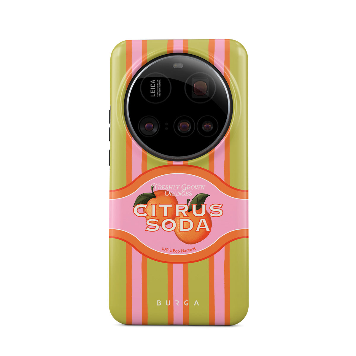 このデザインの特徴:ビビッドなシトラスストライプ、テキスト、シトラス植物、マンダリンオレンジ、グレープフルーツ